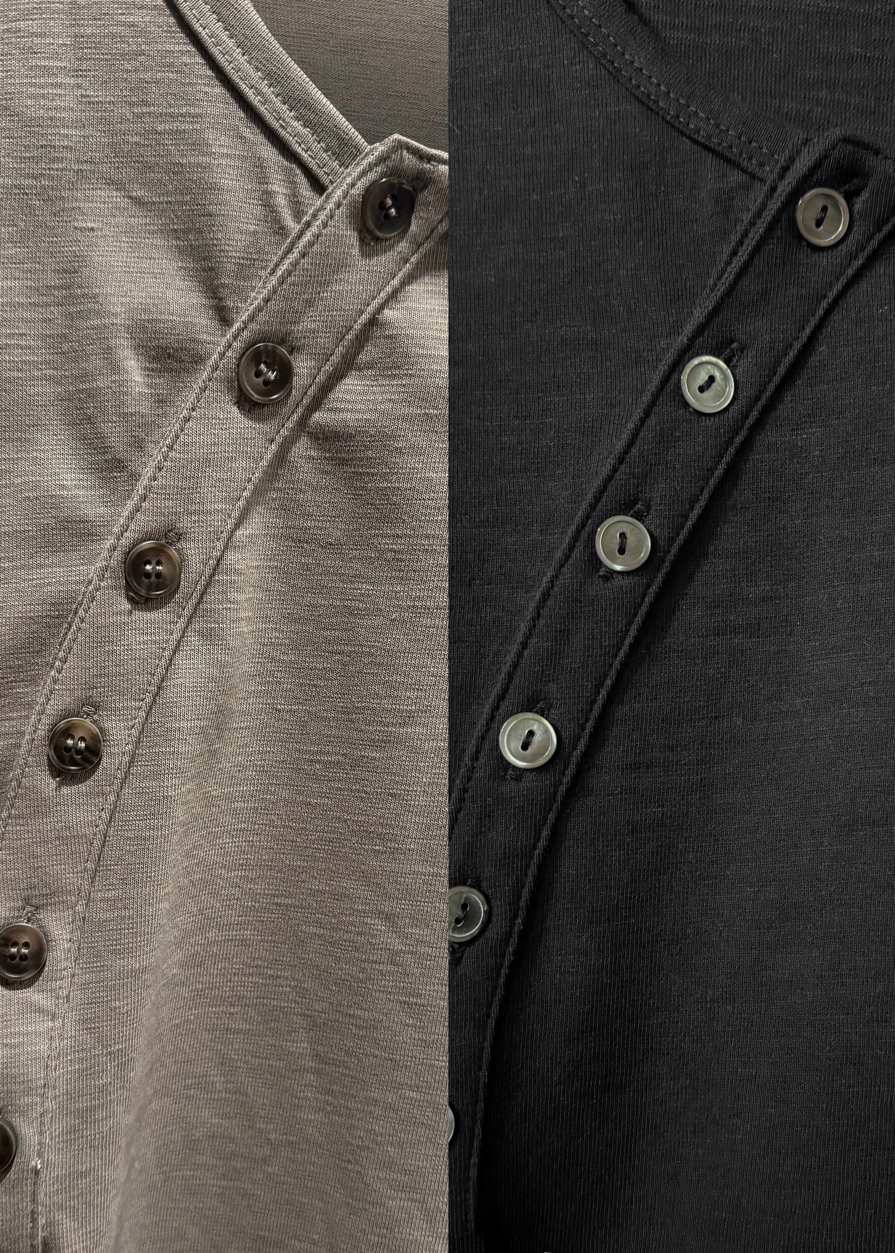 With a curved button placket and secondary ‘belt-peeker’ placket, the Asym Henley brings contemporary details to a timeless silhouette. Precisely crafted in an asymmetric cut, constructed in an enzyme softened stretch slub cotton jersey and completed with mother of pearl buttons. Tailored for a slim and sleek silhouette with a subtle belt-line crop.