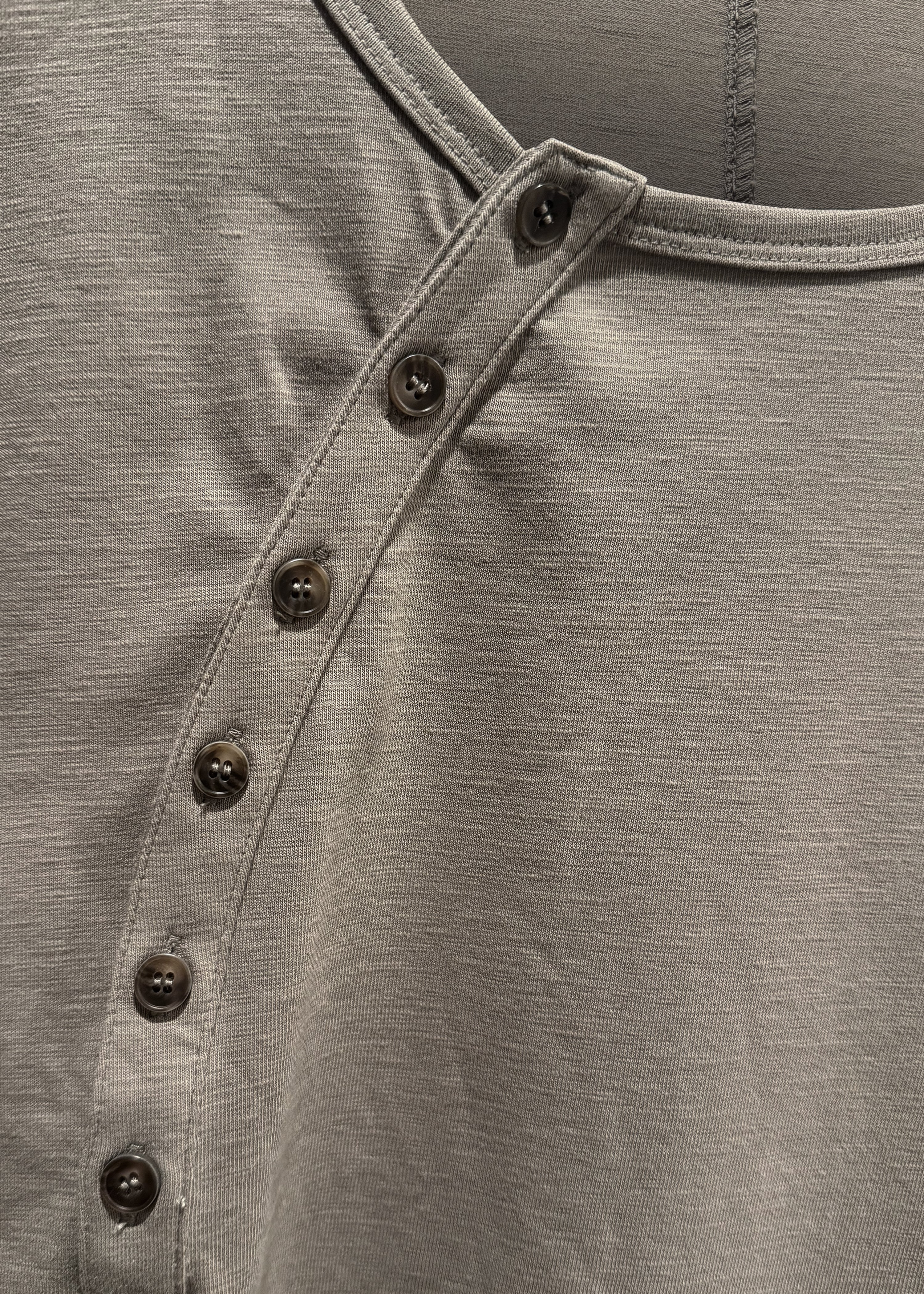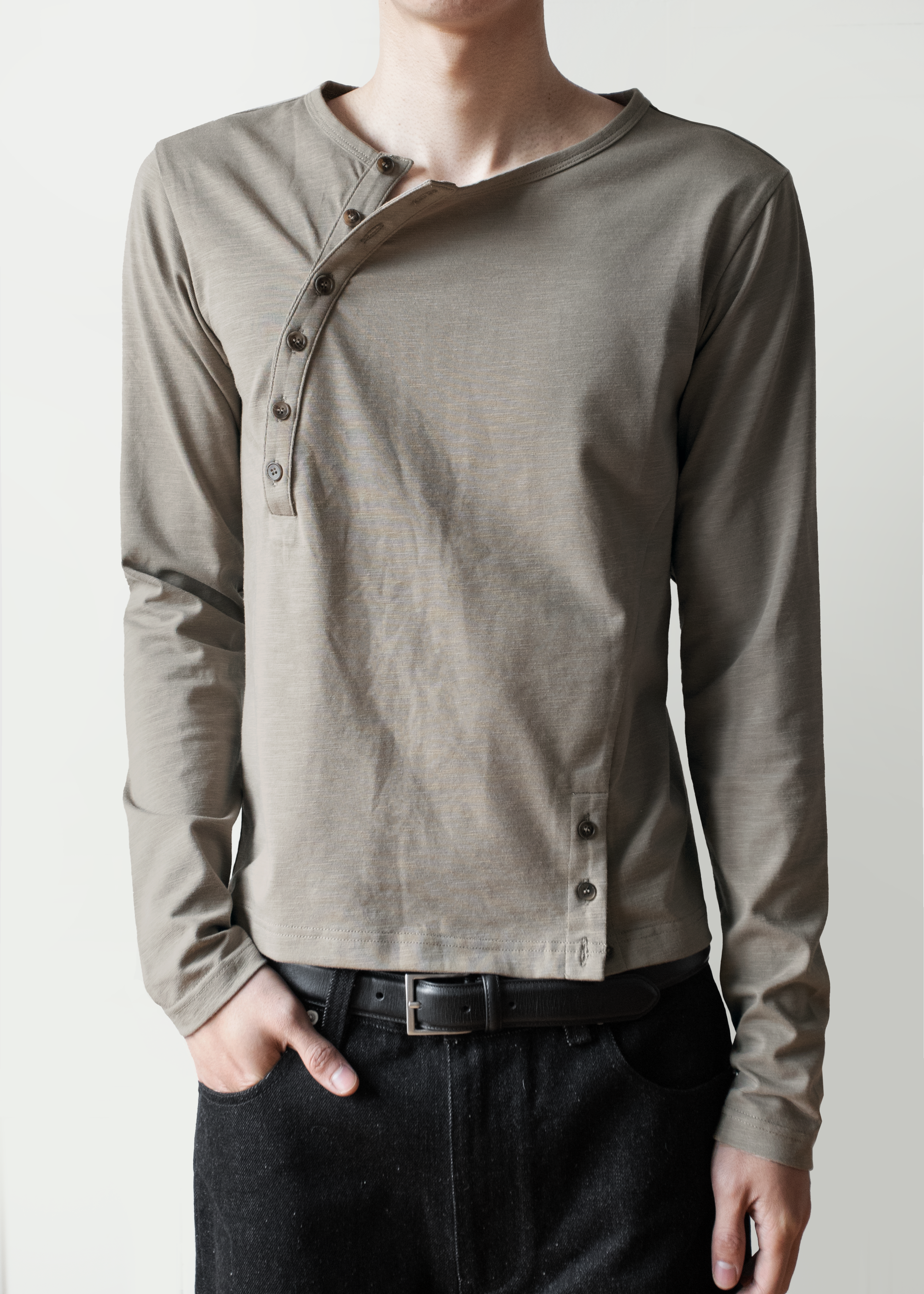 With a curved button placket and secondary ‘belt-peeker’ placket, the Asym Henley brings contemporary details to a timeless silhouette. Precisely crafted in an asymmetric cut, constructed in an enzyme softened stretch slub cotton jersey and completed with mother of pearl buttons. Tailored for a slim and sleek silhouette with a subtle belt-line crop.