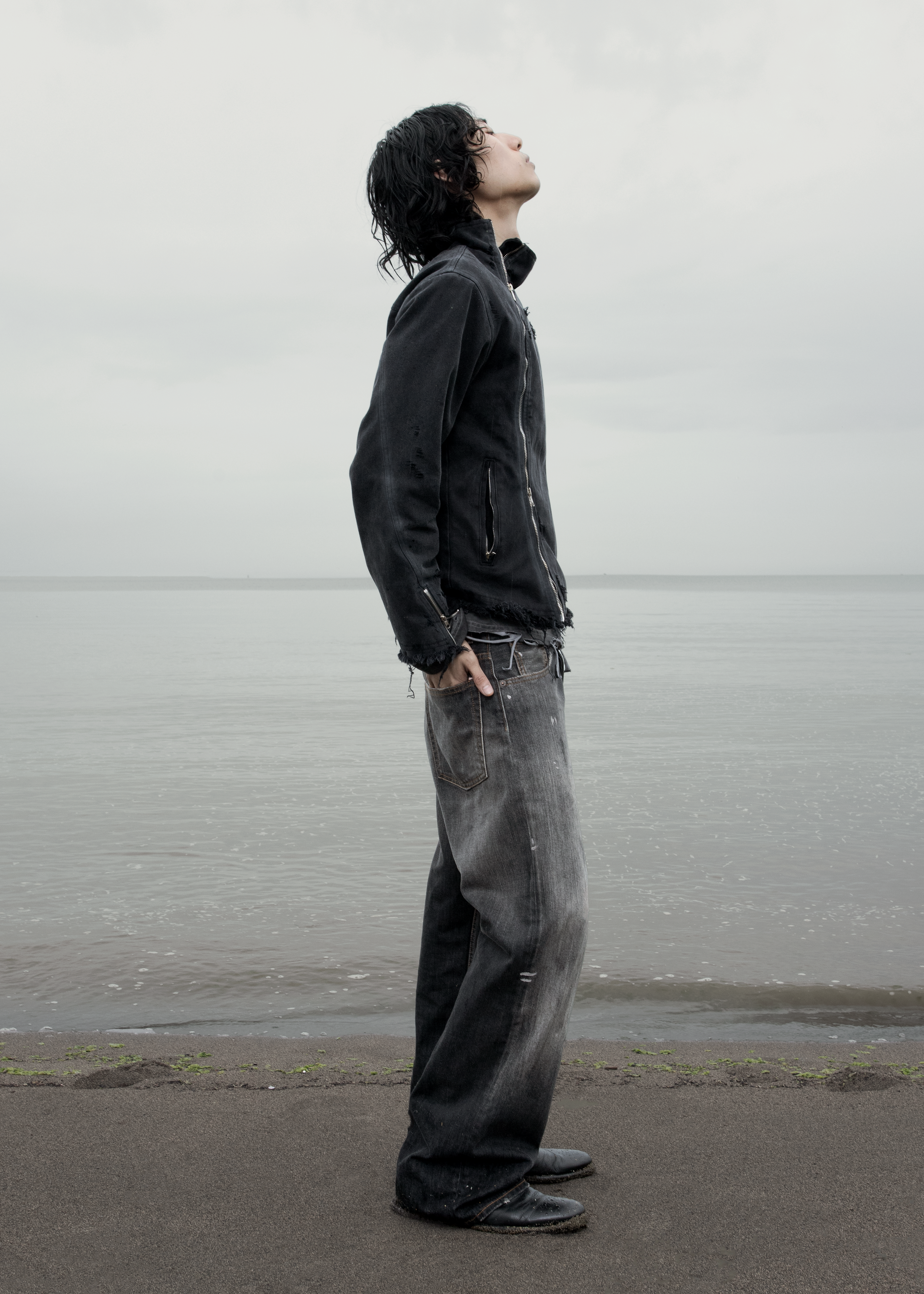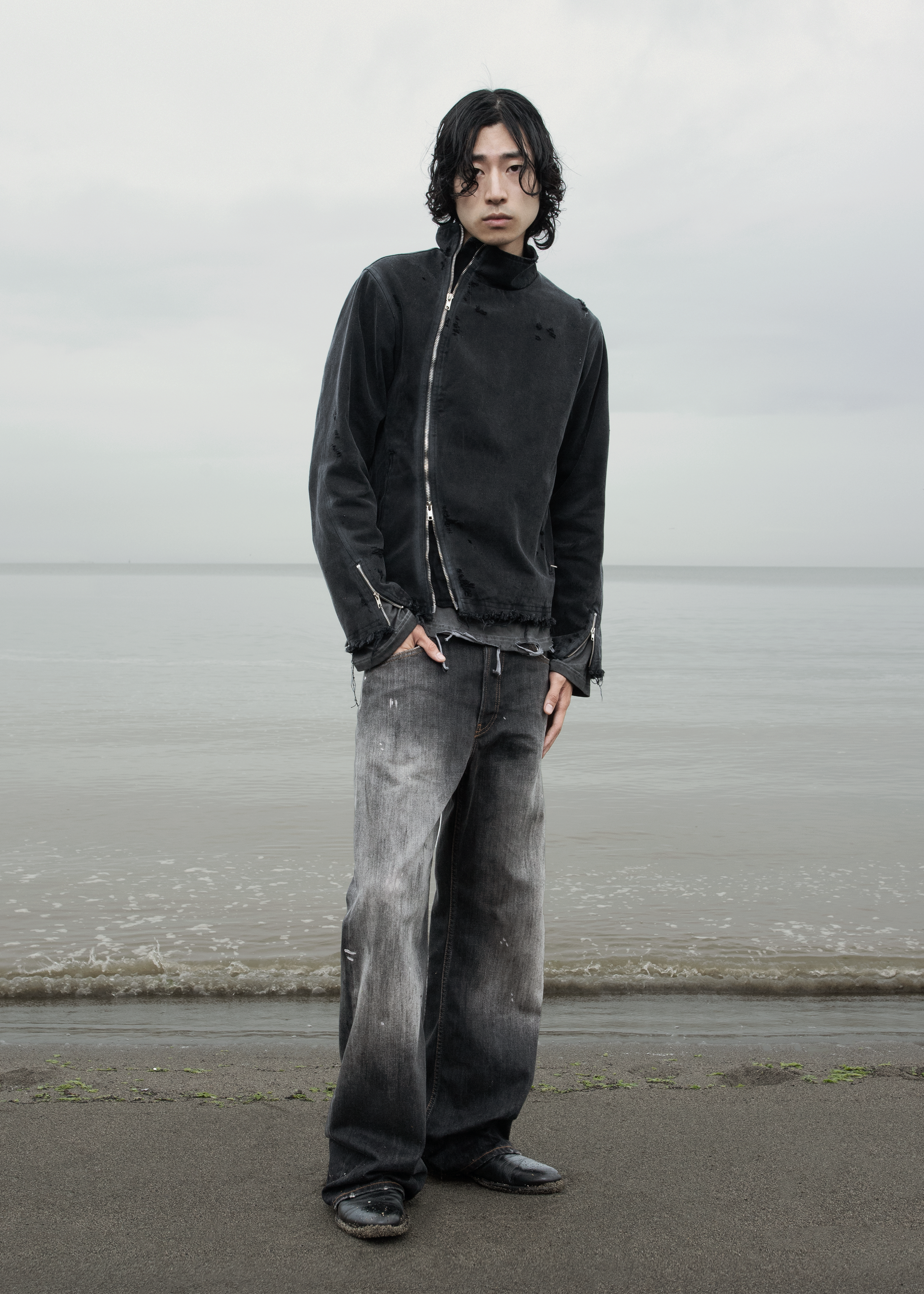 A simple, yet obstructively attractive jacket precisely tailored for a slim & sleek silhouette. A gently curved zipper and softly frayed edges break up the symmetry, adding quiet contrast to an otherwise minimal frame. The jacket itself is made from a 12oz flat woven denim with a secondary lining layer of cotton voile.
