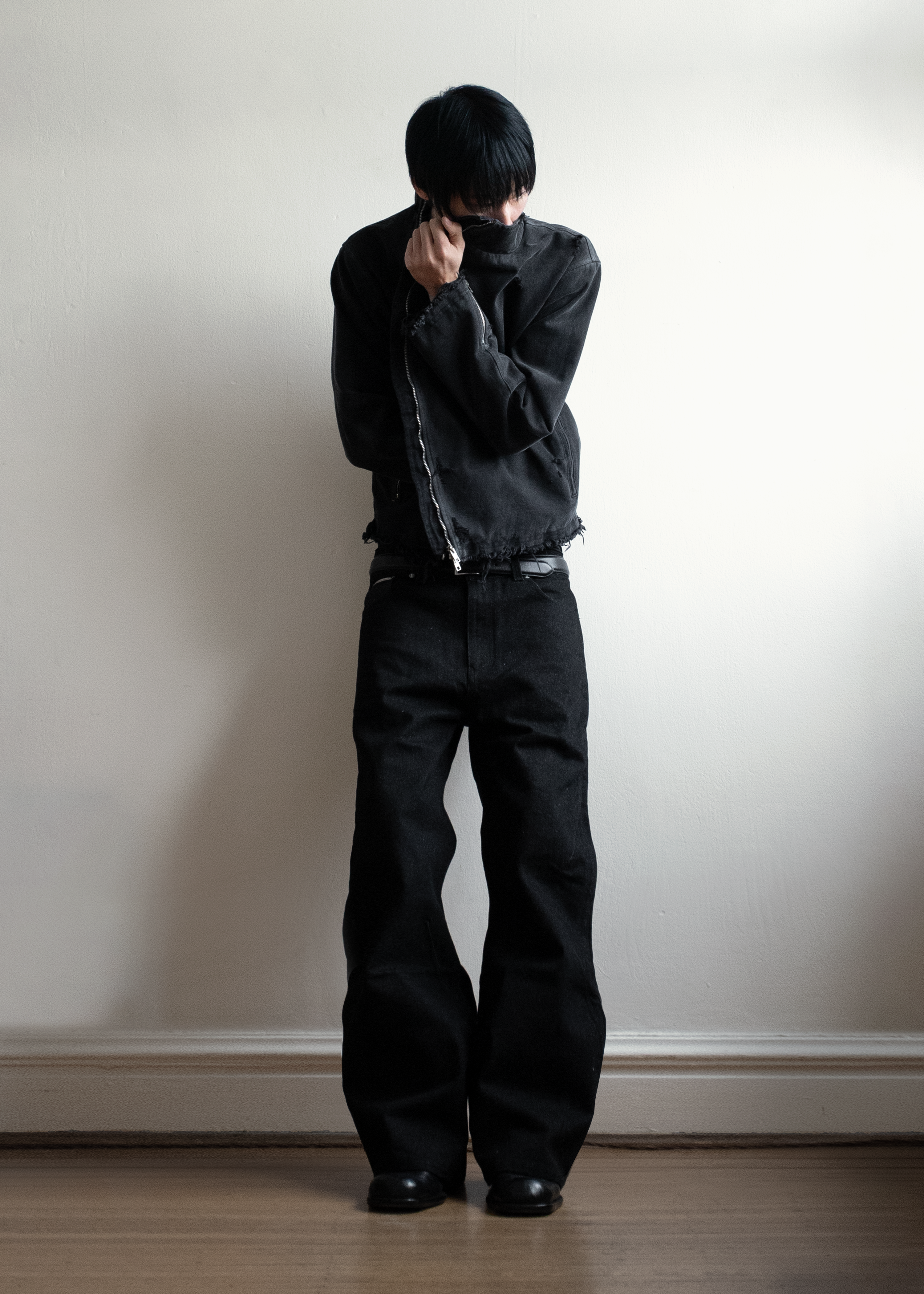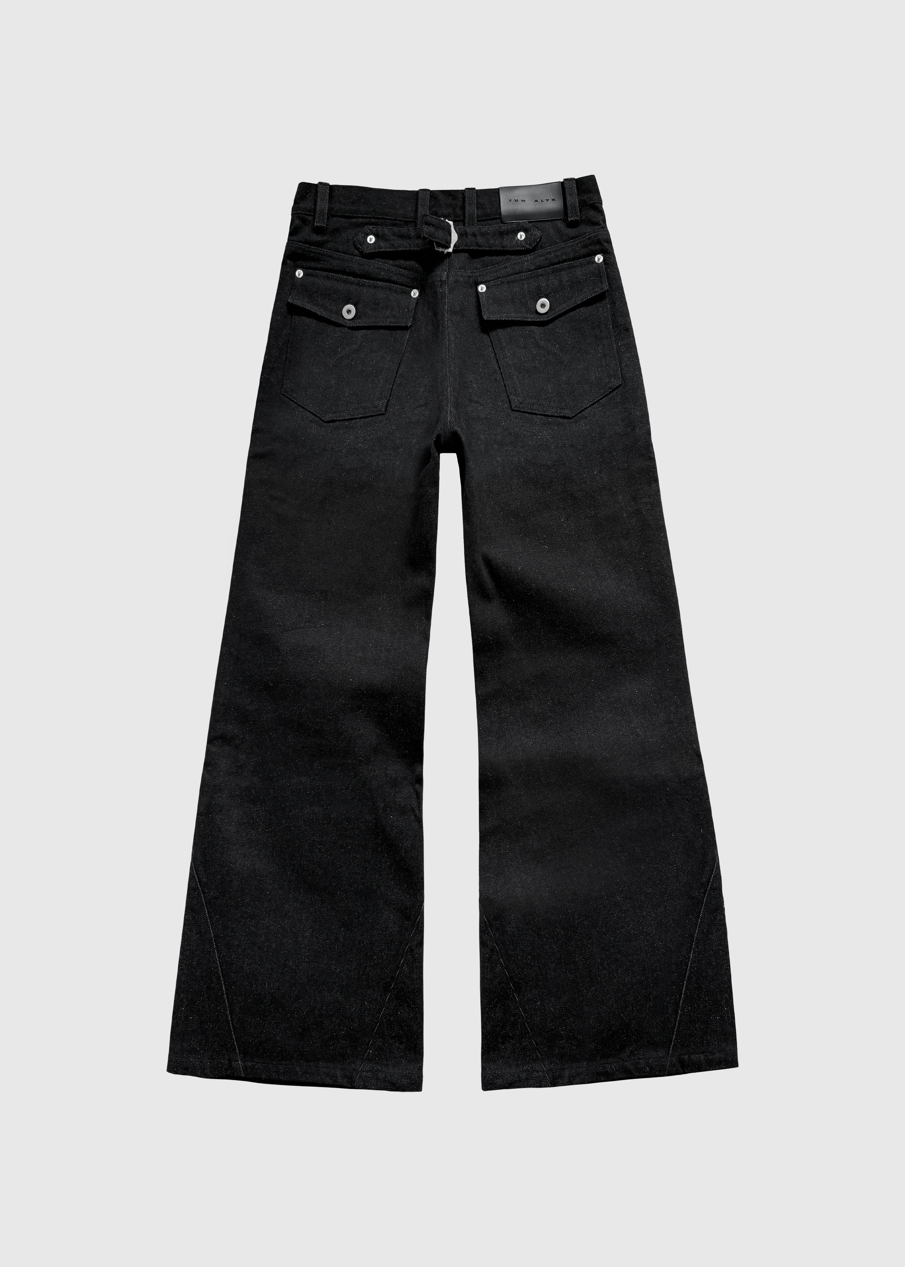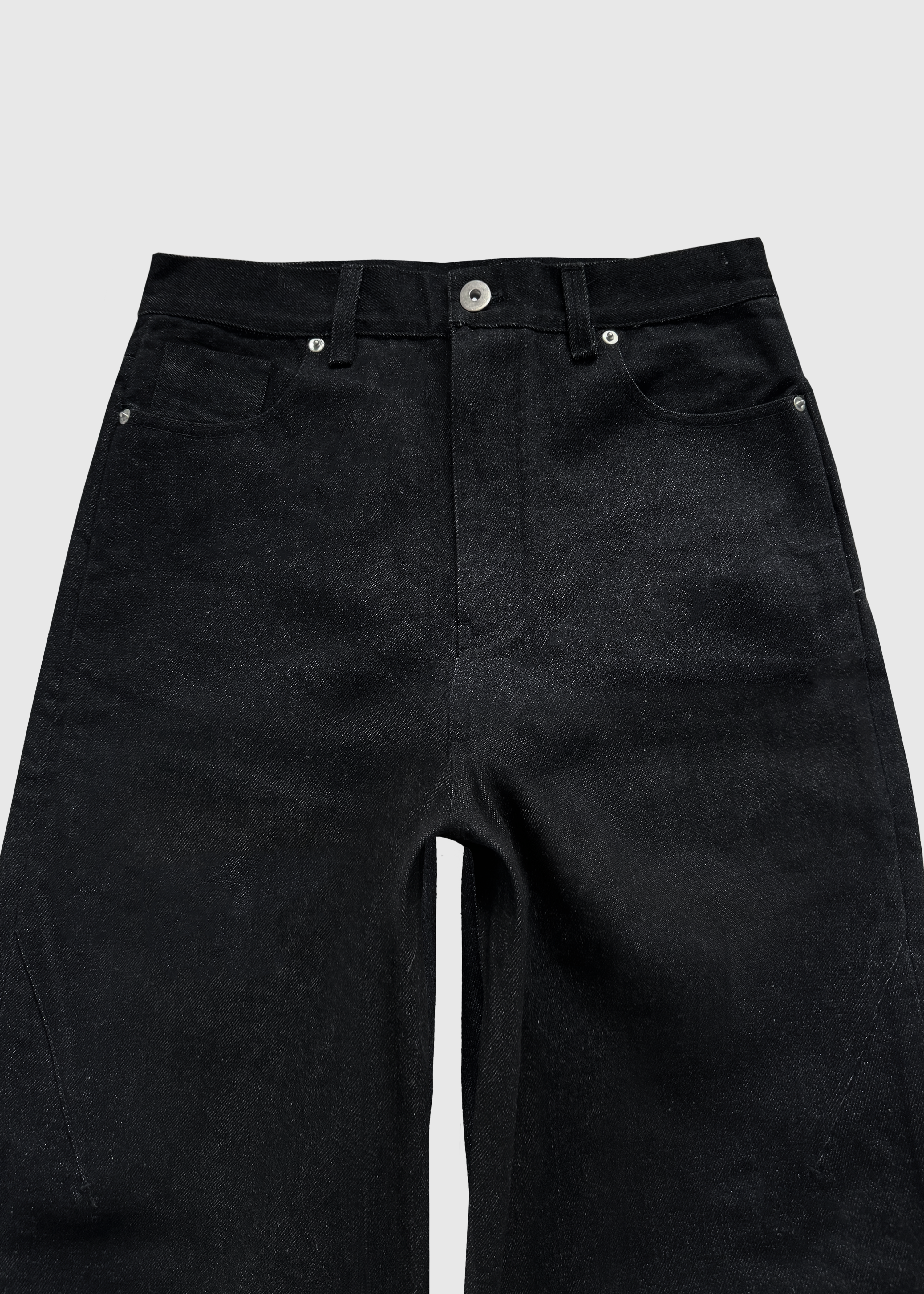 A sculpted take on the classic bootcut. Defined by four exaggerated knee darts and a clean wraparound outseam, the X-Dart Raw Denim is our modern reinterpretation of a heritage fit. Inside, heavy duty cotton twill taped outseams add structure, while flat felling reinforces all major seams for a fully clean finish interior. Cut from a rigid 16oz raw slub denim for a textured finish and shape-holding fit, finished with aged brass hardware.